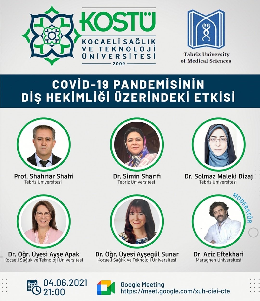Tebriz Üniversitesiyle birlikte gerçekleştireceğimiz ve açılış konuşmasını Rektörümüz Prof. Dr. Fuat BAYRAM’ın yapacağı “COVID-19 Pandemisinin Diş Hekimliği Üzerindeki Etkisi” konulu seminerimize tüm öğrencilerimiz davetlidir.