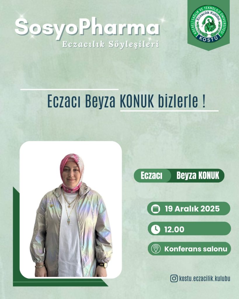 KOSTÜ Eczacılık Kulübü tarafından düzenlenen “SosyoPharma Eczacılık Söyleşileri” etkinlik serisinin yeni oturumu, 19 Aralık 2025 tarihinde Eczacı Beyza Konuk’un katılımıyla üniversitemiz konferans salonunda gerçekleştirildi.