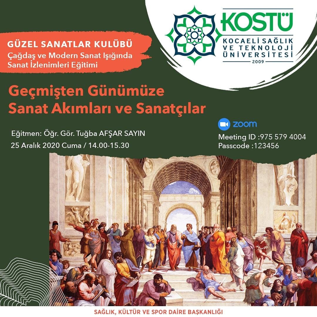 Güzel Sanatlar Kulübü Her Cuma Bambaşka Konularla Bir Araya Geliyor! Tarih 23/12/2020 Bu haftanın konusu “Geçmişten Günümüze Sanat Akımları ve Sanatçıları” Önceki yazı 4 Aralık 2020 tarihinden itibaren Üniversite Kültürü dersi Advancity platformu üzerinden takip edilecektir. 23/12/2020 Sonraki yazı 28 Ekim 2020 tarihli 31288 sayılı Resmi Gazetede yayımlana "Düzeltme ve Ek İlan" 27/12/2020