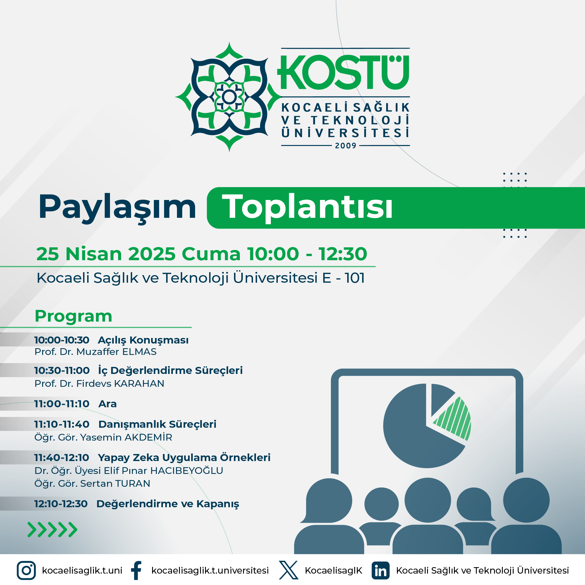 Kocaeli Sağlık ve Teknoloji Üniversitesi olarak, 25 Nisan 2025 Cuma günü saat 10:00 – 12:30 arasında E-101 nolu salonda gerçekleştireceğimiz Paylaşım Toplantısı’na sizleri bekliyoruz.