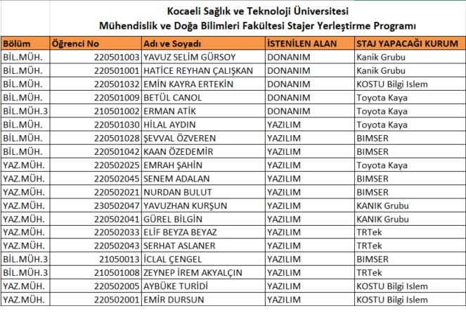 The Faculty of Engineering and Natural Sciences has secured internships for successful students during the 2023-2024 summer semester. The internships and their respective institutions are listed below. Students can apply to the relevant job by completing the Professional Practice Form on our website, having it approved by a member of the Internship Committee, and then applying to the relevant job.