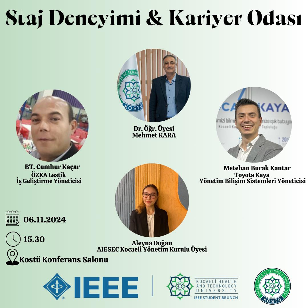 6 Kasım 2024 saat 15.30’da ÖZKA Lastik, Toyota Kaya ve AIESEC’den gelen temsilcilerle staj deneyimleri ve kariyer ipuçlarını paylaştığımız Staj Deneyimi & Kariyer Odası etkinliğini IEEE öğrenci kulübünün organizasyonu ile gerçekleştirdik. ÖZKA Lastik’den gelen Cumhur Kaçar, Toyota Kaya’dan gelen Metehan Burak Kantar ve AIESEC’den gelen Aleyna Doğan ve ekibi sunumlarını gerçekleştirdi. Ayrıca Mehmet Kara hocamız öğrencilerimizin staj değerlendirmelerini paylaşan bir sunum gerçekleştirdi. Katılımcılara Teşekkür belgelerini Fakültemizin değerli hocaları sunumlar sonunda takdim etmiştir.