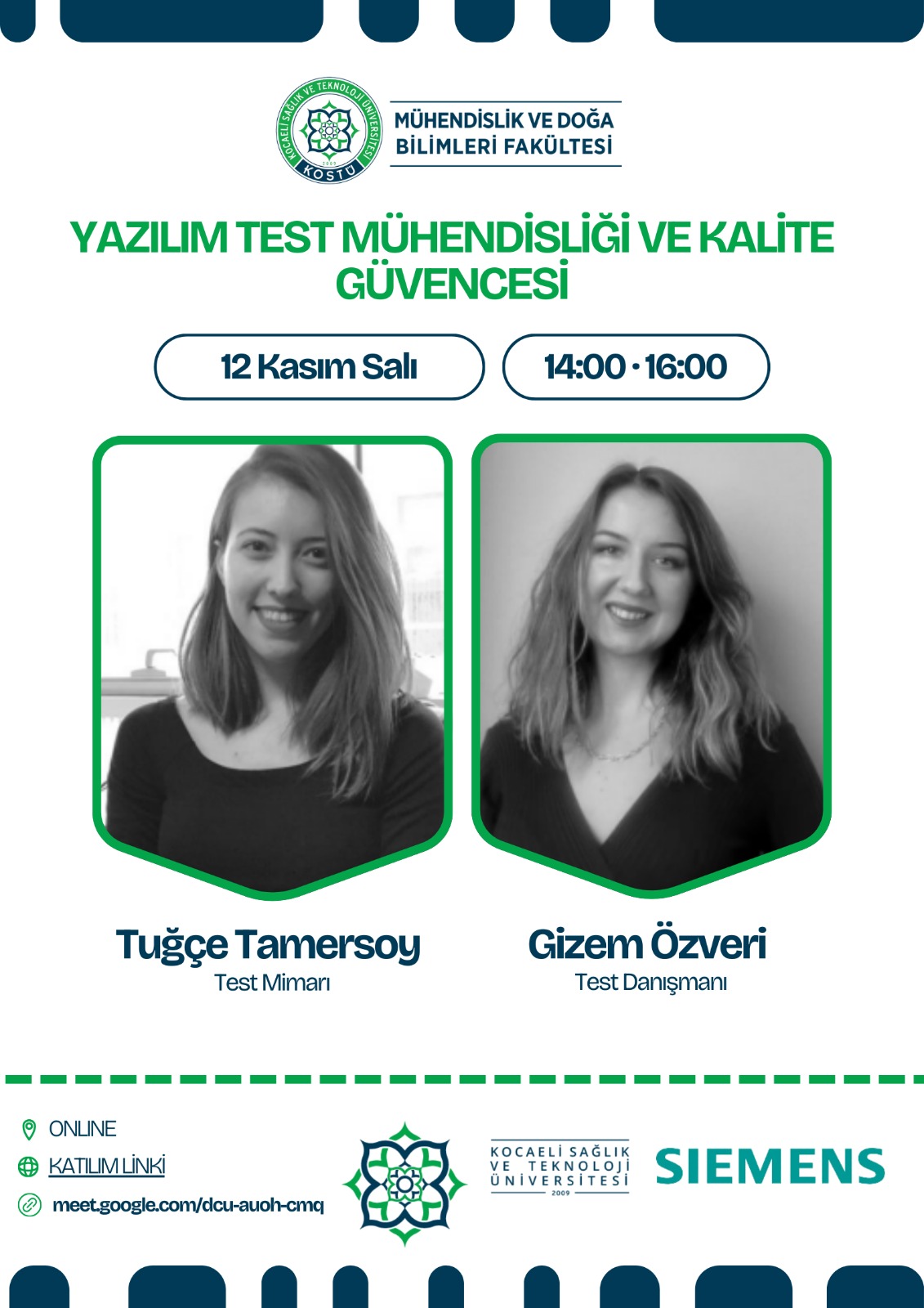 12 Kasım 2024 Salı günü Siemens desteğiyle gerçekleştireceğimiz “Yazılım Test Mühendisliği ve Kalite Güvencesi” başlıklı online seminer aşağıdaki linkten gerçekleştirilecektir.